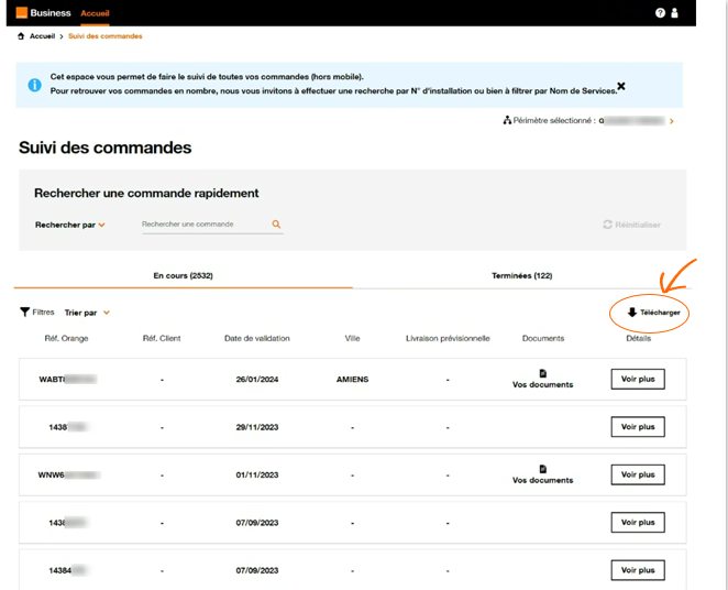 Sur la page Suivi des commandes, cliquez sur le bouton Télécharger pour disposer de l'ensemble de vos commandes au format pdf ou xls.